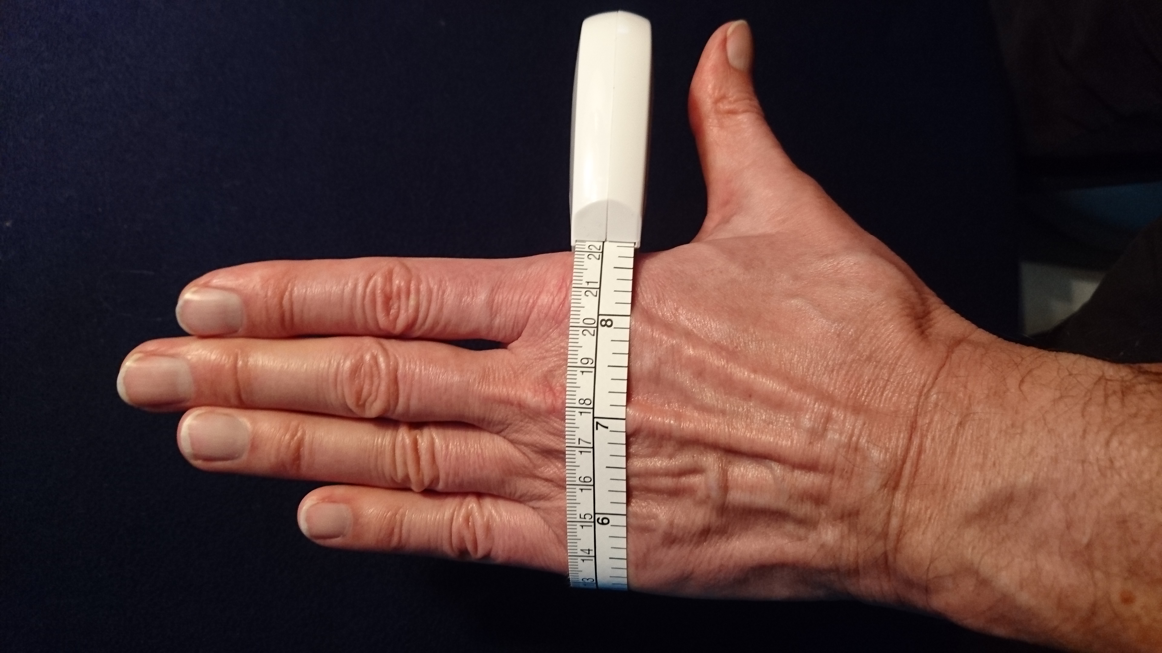 Der Handumfang wird mit einem Bandmaß über den Fingergrundgelenken des 2. bis 5. Fingers bei angespannter Hand und abgespreiztem Daumen gemessen, am besten durch eine 2. Person, bei Rechtshändern links, bei Linkshändern rechts.